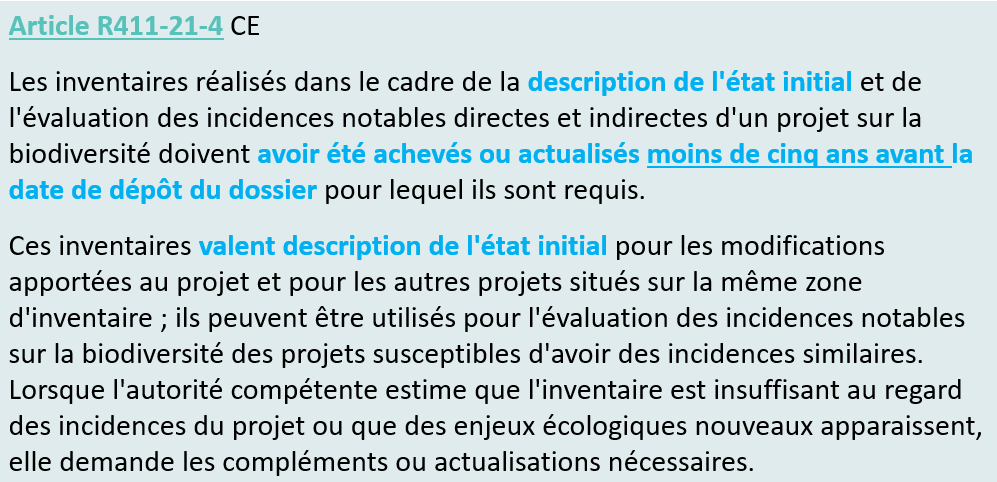 Conséquences : Acte une validité de 5 ans des inventaires faune flore (doctrine précédente parfois 3 ans, voire moins selon les territoires)