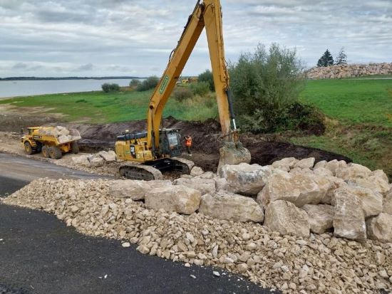 230.000 tonnes d’enrochements en calcaire, plus 88.000 tonnes de roches « filtre », de 20 à 150 mm de diamètre, les volumes sont conséquents, à la mesure du lac réservoir et des 5 barrages disposés sur ses rives occidentales. Le choix technique, celui des enrochements, fait l’objet d’une justification détaillée sur le site de l’EPTB. Il a été préféré à la pose d’un nouveau revêtement bitumeux ou béton et à des dalles préfabriquées, pour des raisons de robustesse et de durabilité, explique l’EPTB et il permet « ne pas avoir à déposer le revêtement existant ».