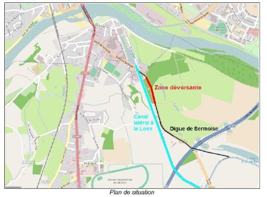 A Sermoise-sur-Loire, le chantier de prévention des inondations (Pi) représente une des dernières étapes de ce programme d’action. Le projet consiste à abaisser la route digue domaniale sur un tronçon de 250 mètres, pour ensuite «créer une zone de surverse entre la digue route et le canal », explique Hubert Fallet. En cas de crue bicentennale, l’eau de la Loire, qui vient de l’Est, «pourra passer de l’autre côté de la route pour aller ensuite dans le canal, avant de ressortir de l’autre côté à l’Ouest. On évitera les risques de brêche de la digue», ajoute-t-il. La zone de surverse sera délimitée par deux merlons en terre, perpendiculaires au traçé de la route. L’ensemble suppose des travaux de terrassement entre la route et le canal, sur la future zone de surverse.