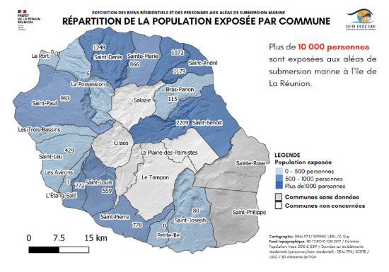 Les trois communes avec le plus de personnes exposées « fortement » à une submersion de type centennale sont celles de Saint-Benoît (1127), Saint-André (764 personnes) et Sainte-Suzanne (531), d’après les estimations du BRGM figurant dans l’Atlas. Les zones à risque sont en général bien identifiées, en particulier dans les plans de prévention des risques littoraux.
