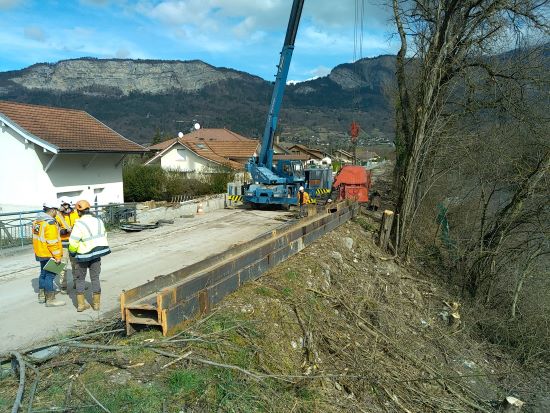 Une autre technique est mobilisée juste à l’amont de la confluence avec l’Arve : il s’agit de la création d’une nouvelle digue en retrait, associé à un adoucissement de la berge. Le tracé de digue va ainsi s’éloigner du cours d’eau. Ici un seuil transversal, qui entrave le passage des espèces piscicoles sera remonté plus en amont et rendu franchissable. Pourquoi maintenir un seuil ? Il stabilise les sédiments et évite une érosion supplémentaire, en fixant le lit de la rivière. « Sans ces seuils artificiels, il est possible que la rivière reprenne son érosion, ce qui fragiliserait encore les berges », signale le directeur du SM3A. Le seuil permet aussi de faire passer à moindre coût le réseau d’eaux usées, afin d’atteindre la station d’épuration située sur l’autre rive.